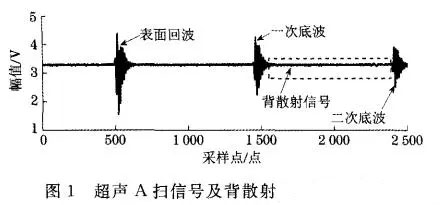 在不同固溶溫度(900~1150 ℃)下對GH4169試樣進行固溶處理。采用脈沖回波法對試樣進行縱波超聲檢測,探頭頻率為10 MHz,用一次底波、二次底波的峰值、時間差和試樣厚度計算衰減系數、聲速,對截取的背散射信號(截取位置為一次底波和二次底波之間,如圖1所示)進行經驗模態分解,取分解后生成的固有模態函數,計算平均功率w;和波形維數FsHA,計算公式如式(1)所示。